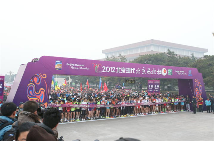 2012北京现代?北京马拉松赛于11月25日在天安门广场鸣枪起跑,共有12000名选手参与全程项目的比赛,半程和迷你项目参赛人数分别为8000和10000人。北马冰雪季不但没有吓退马拉松跑友,反而激发了大家的热情,30000名额仅用时94小时便全部报满。2012年北京马拉松在赛事主视觉设计上融入了极具中国特色和北京风韵的脸谱图案,给参与者以耳目一新的感觉;在项目设置上取消了9公里项目的设置,增大了全程项目选手规模。