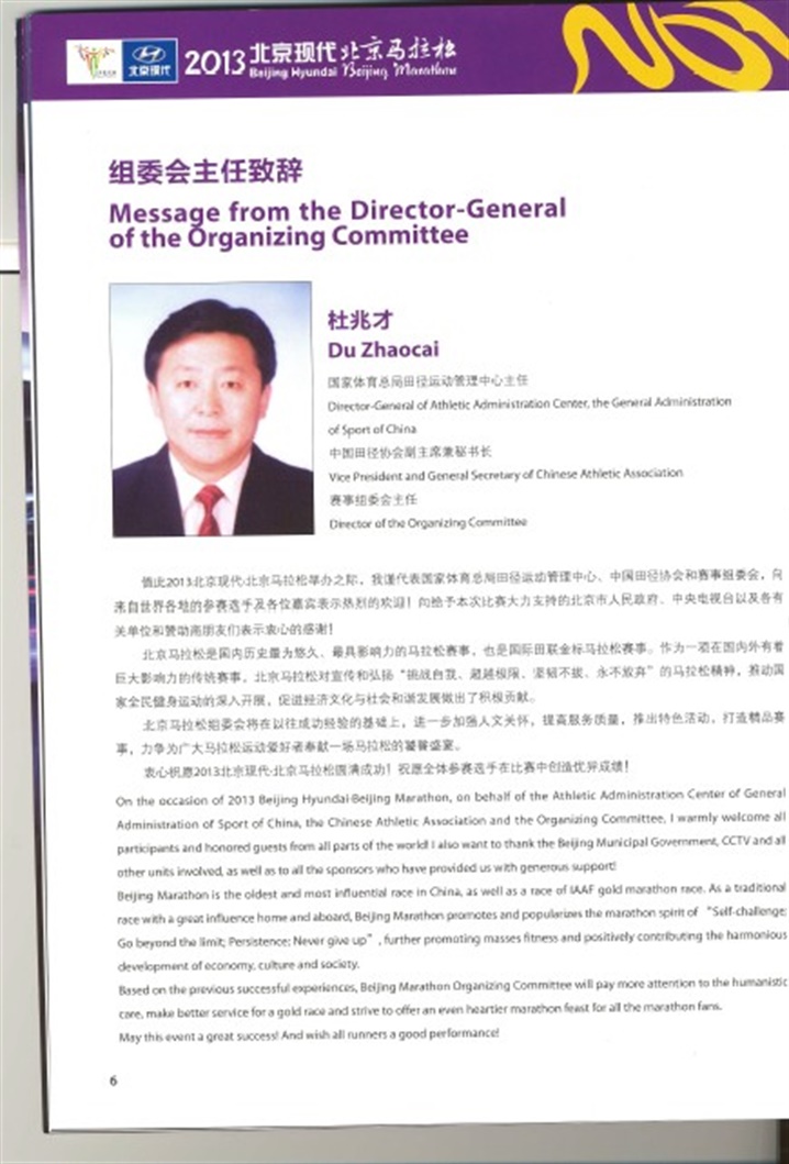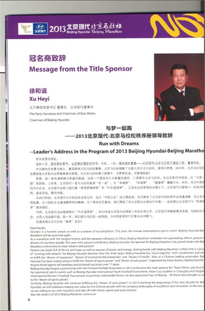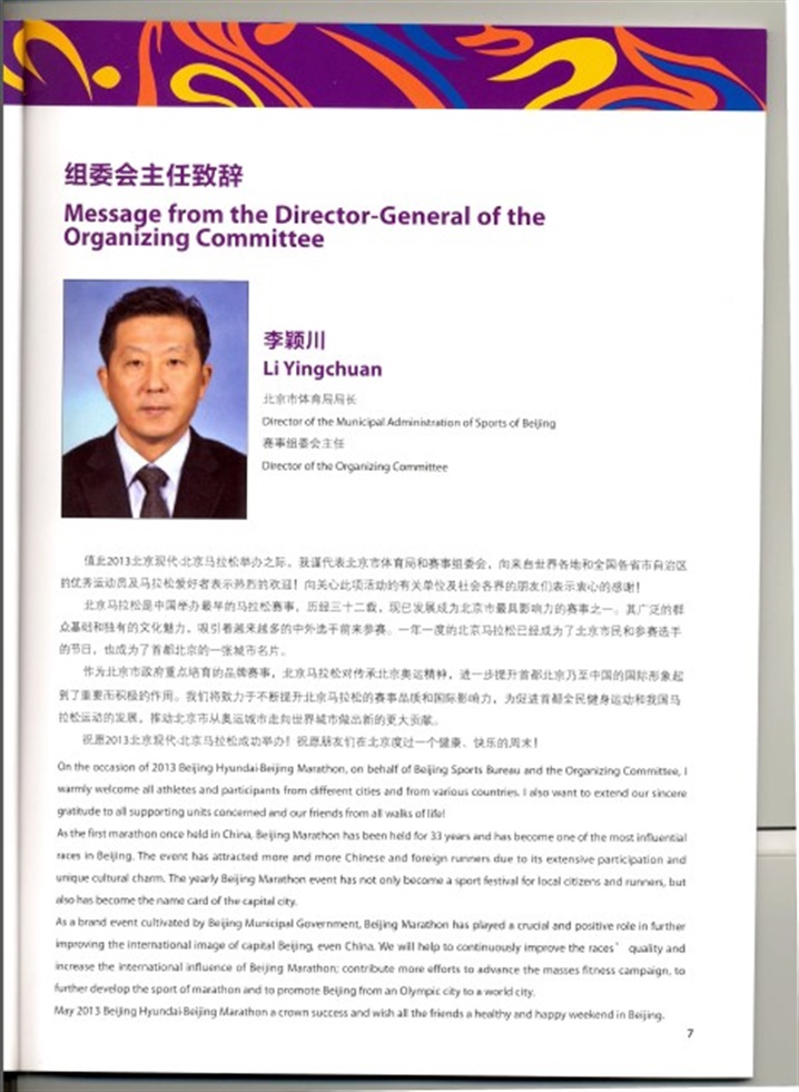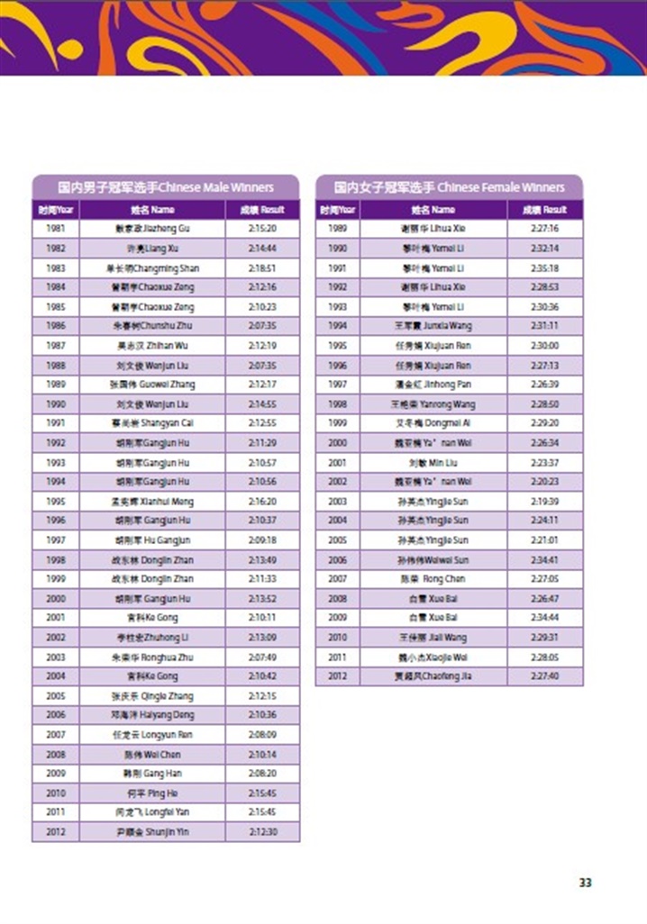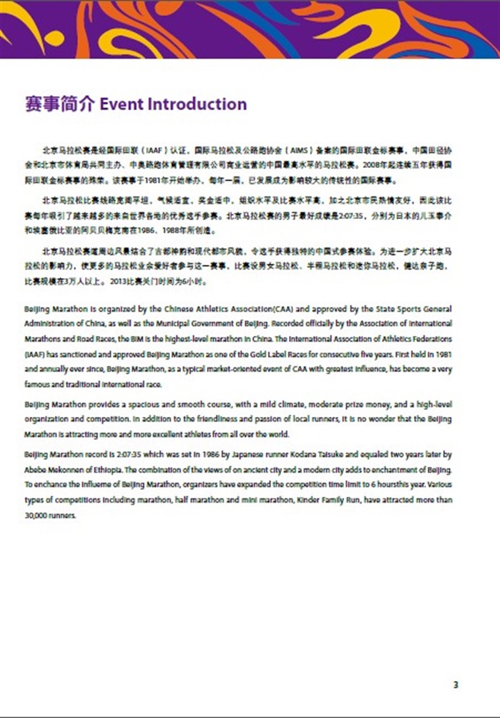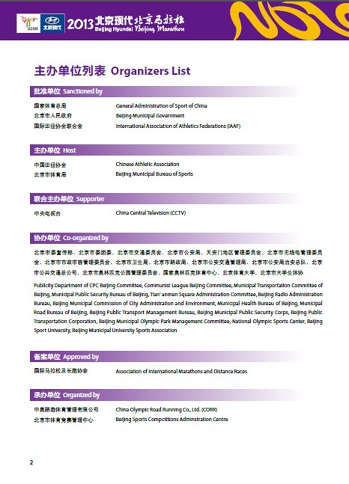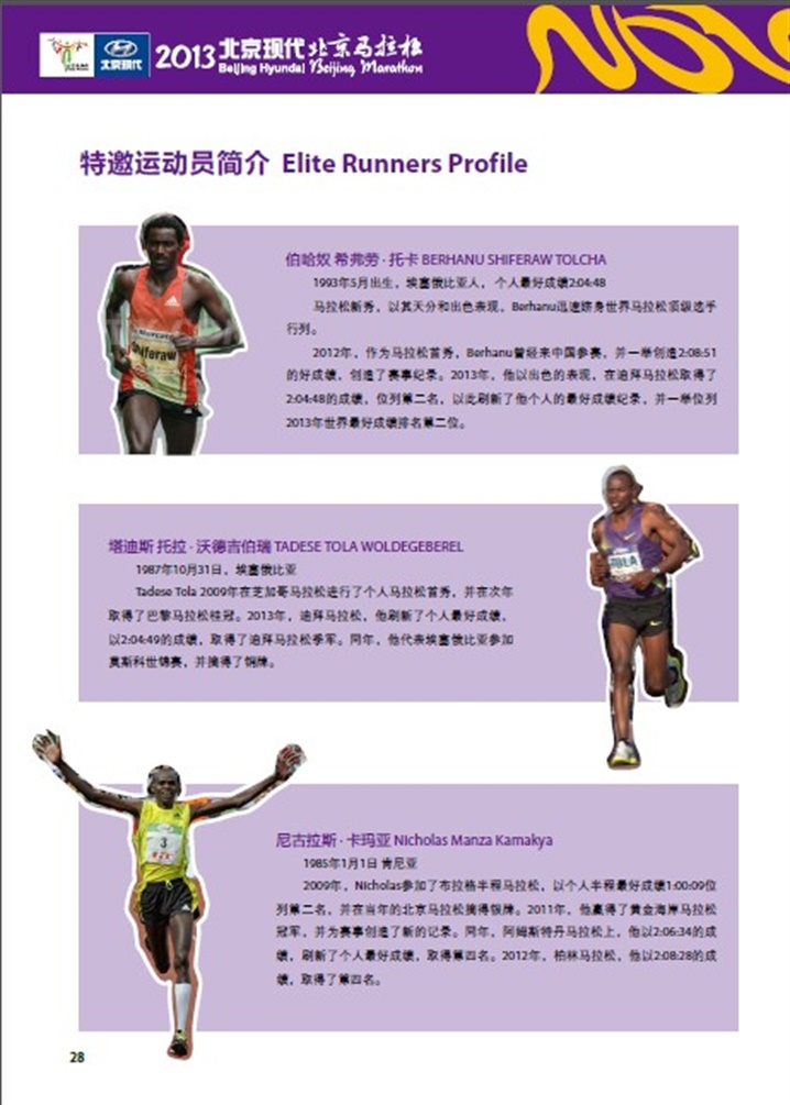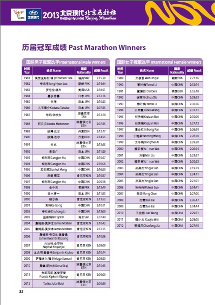 2013北京马拉松赛是在首都北京举办的第卅三届马拉松赛事。有包括全程马拉松、半程马拉松、小马拉松和亲子跑在内的30000名选手报名参赛。比赛路线由天安门广场出发,途径金融街、钓鱼台国宾馆、昆玉河、知春路、学院路、奥林匹克森林公园回到奥体中心结束。男子组,最好成绩是由埃塞俄比亚的选手托拉·沃尔德格贝里尔以2小时7分16秒获得冠军,本纳德·基普洛浦和罗诺·丹尼尔分别以2小时7分19秒和2小时7分20秒的成绩获第二、三名。他们的成绩都打破了由日本选手儿玉泰介(1986年)和埃塞俄比亚选手阿贝贝·梅克南(1988年)共同保持的2小时7分35秒的赛会记录。女子组,中国选手张莹莹在比赛最后阶段一骑绝尘,击败多名肯尼亚和埃塞俄比亚好手,以2小时31分19秒的成绩获得冠军,至此,中国女将已经连续22年获得北京马拉松女子组比赛的冠军。埃塞俄比亚选手哈伦·哈吉和塔德塞·比法分别获得第二、三名。